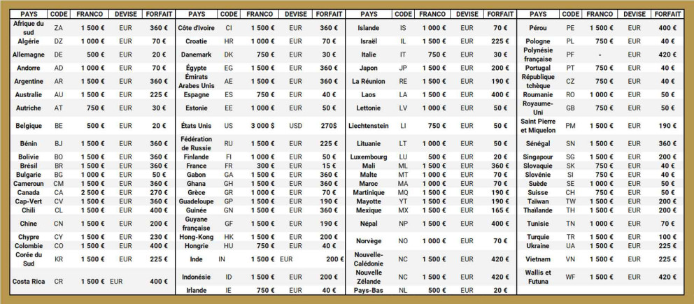 Vous retrouverez tous les tarifs pratiqués par pays dans le tableau ci dessous.
